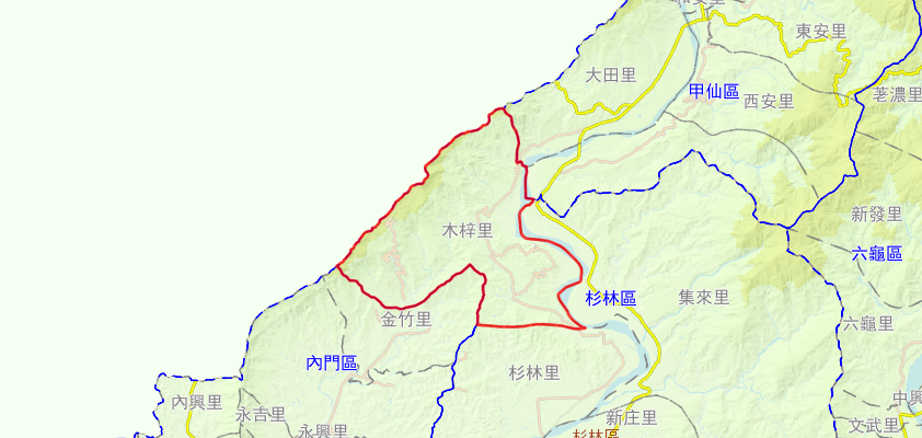 東有旗山溪相隔集來里 西至內門區木柵里 南至本區杉林里 北至甲仙區寶隆里 |